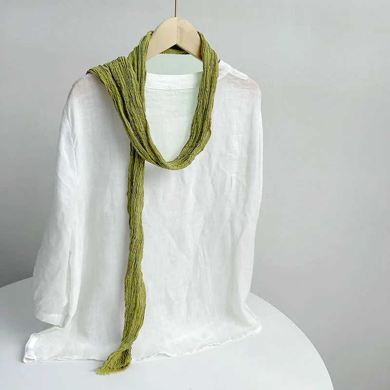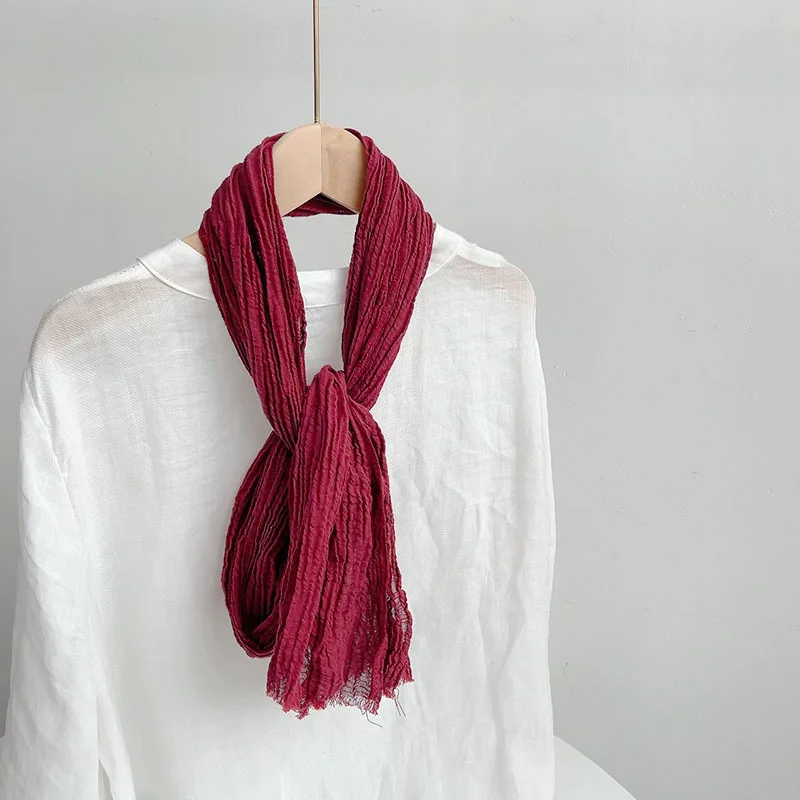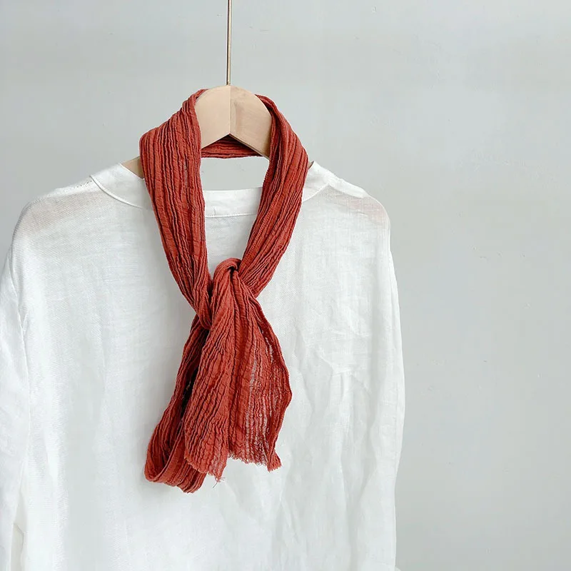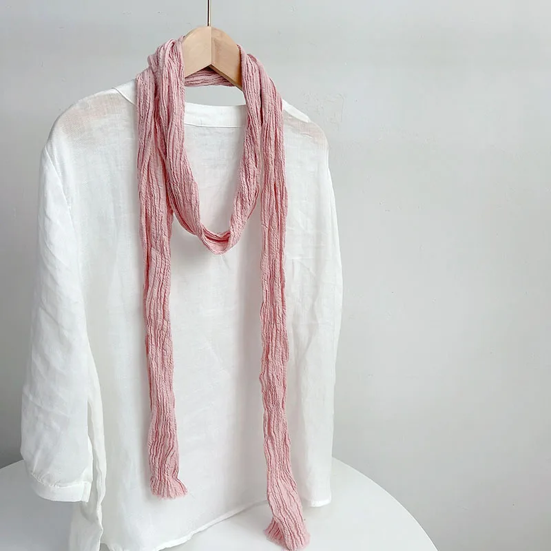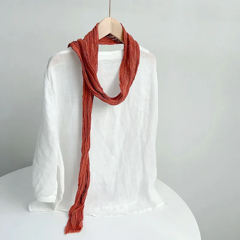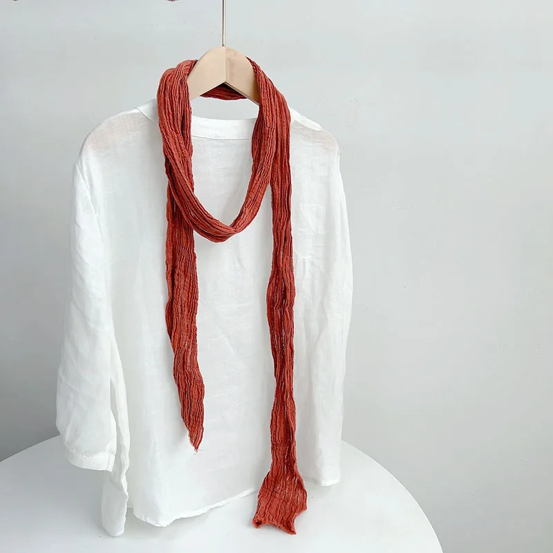 Retro pleated ramie scarf slender narrow and long scarf Japanese forest women's versatile elongated neck protection scarf